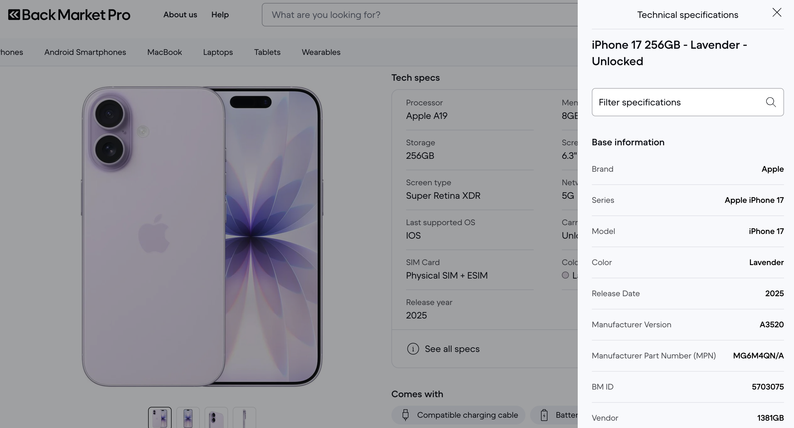 All general information about a product’s technical specifications is available in the "Technical Specifications" section of the product page. There you will find details such as the model, capacity, or operating system.