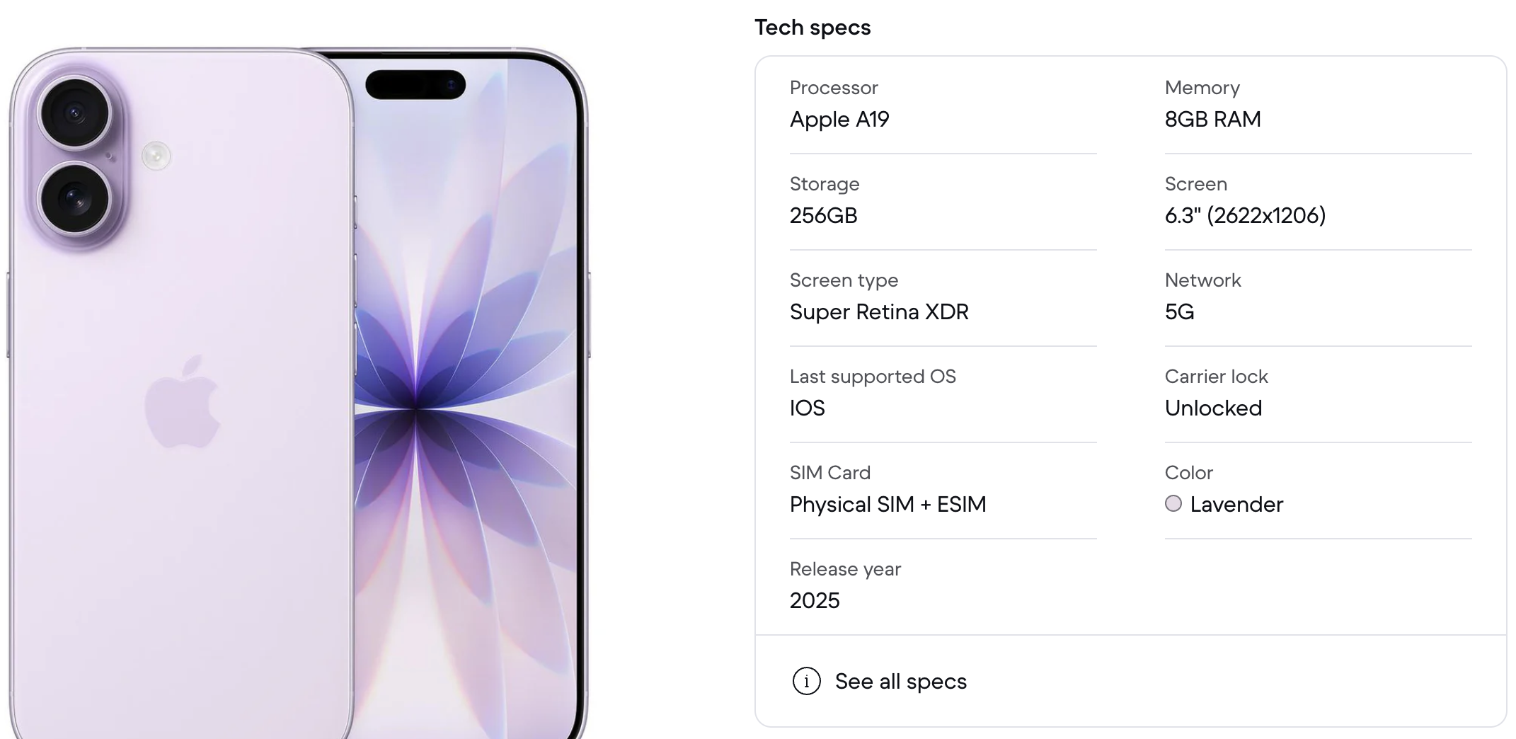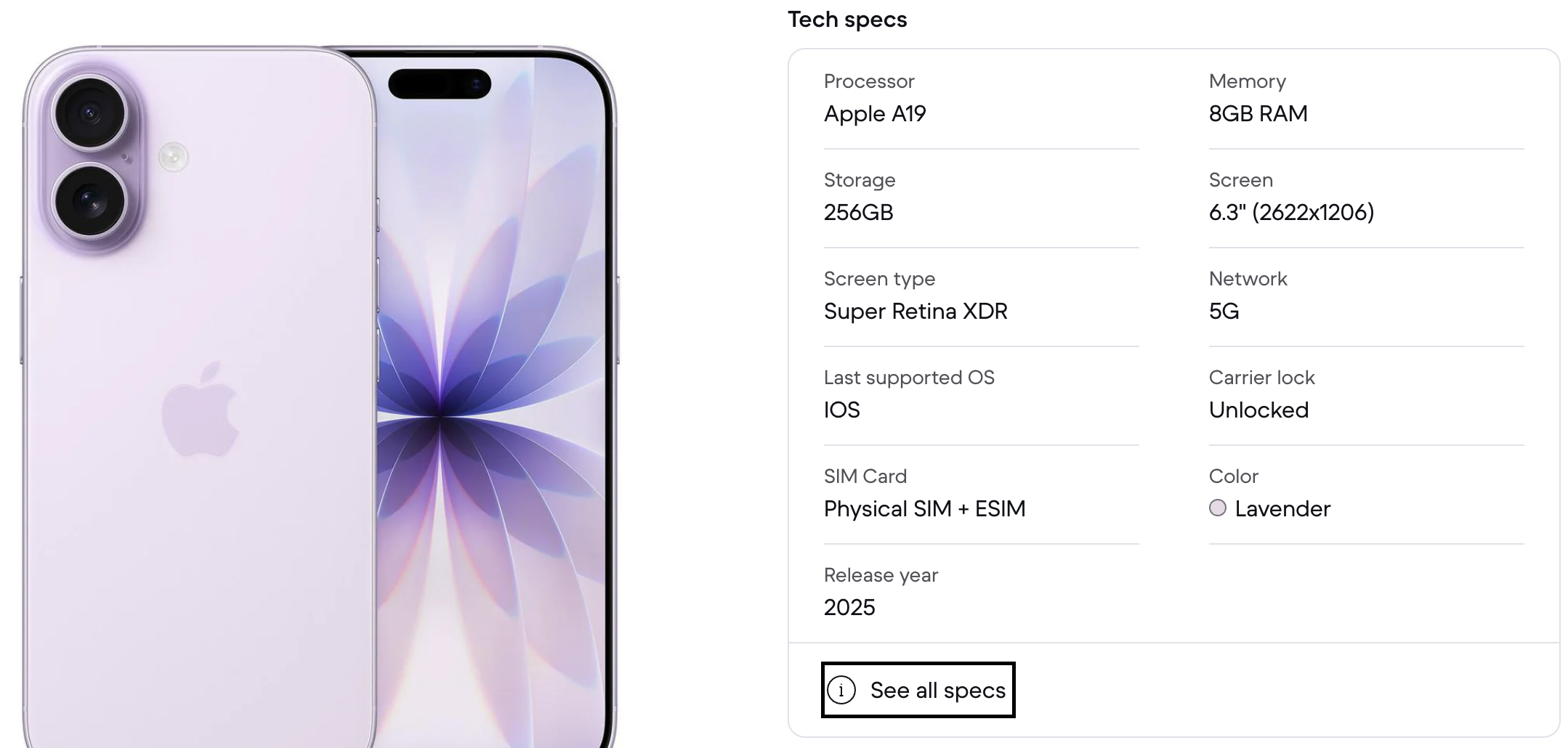 - Go to the desired product page: you will find a section called "Technical Specifications" (Tech Specs) on the product page. Here is an example: